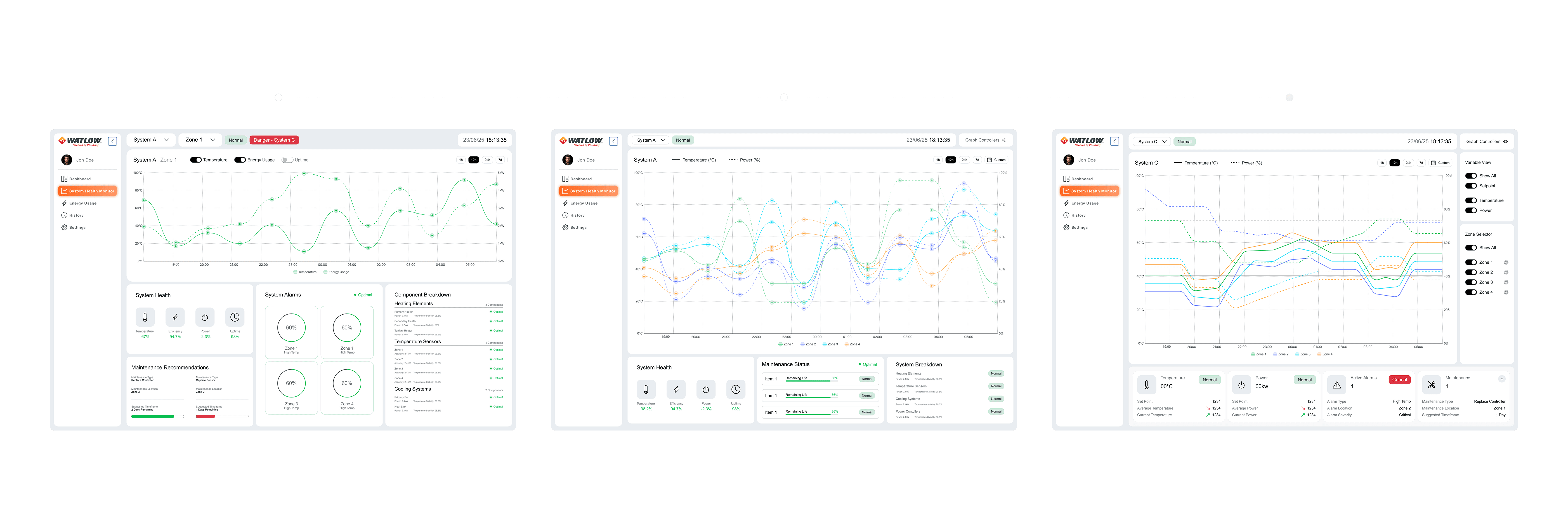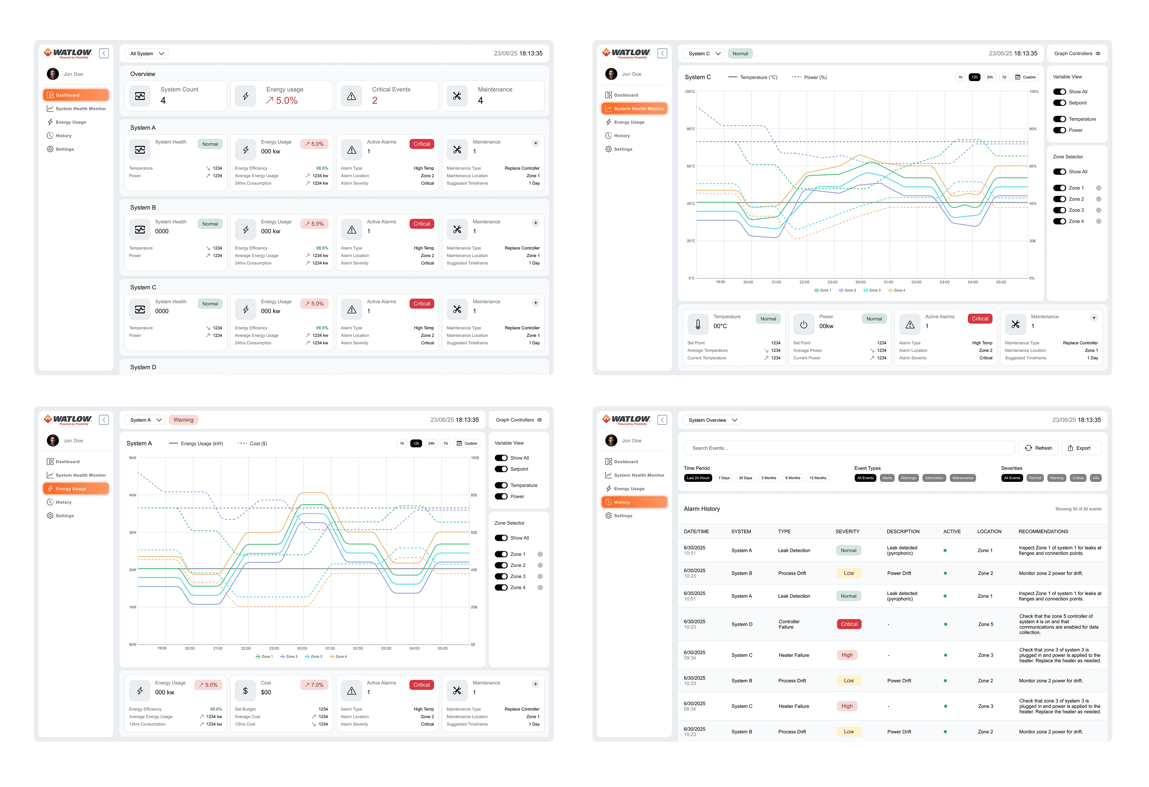 Thermal Watch was structured around a scalable information architecture, transforming complex datasets into clear, navigable hierarchies. Each component, from visual charts to system alerts, was designed to be reusable & aligned with the Watlow Base Library.